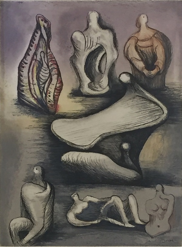 Moore desarrolla un lenguaje pictórico muy personal para representar la tridimensionalidad en el papel, considerando al dibujo como pilar fundamental de su trabajo y como camino independiente para expresar sus ideas en torno al alma de la modernidad. Entre éstos destacan “Figures with sky background II”, “Five ideas for sculpture”, “Seven sculpture ideas II”, “Kneeling woman”, “Mother & child”, “Reclining woman” y “Reclining woman on beach”, entre otras.