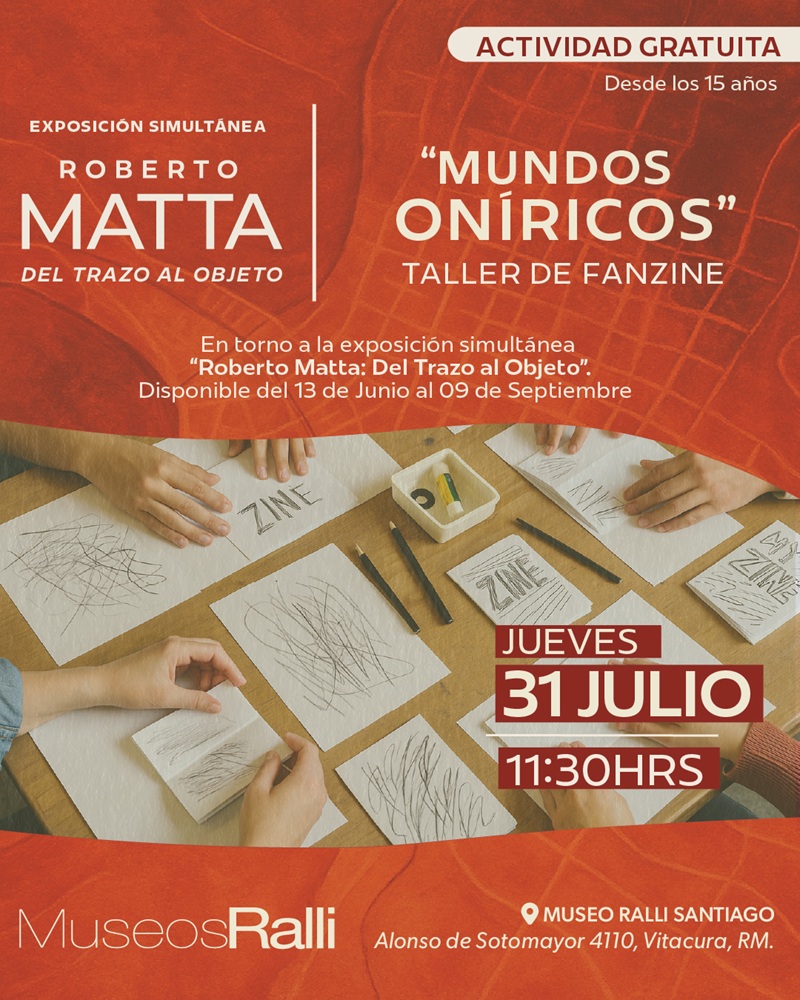 En el marco de la exposición simultánea, en torno a la obra gráfica de Roberto Matta, Museo Ralli Santiago realizará talleres de mediación gratuitos para jóvenes, a partir de los 15 años y adultos, que permitan explorar el automatismo surrealista y experimentar el proceso íntimo de su creación, lo invisible y sensorial en la abstracción Matta. Estas actividades de extensión estarán a cargo de Valentina Sagredo, Licenciada en Historia, artista y mediadora.