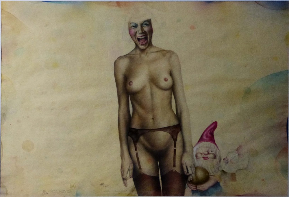 La Sala Sergio Camporeale contará con 9 obras de su autoría en técnica mixta sobre papel, a través de las cuales disfrutaremos de sus característicos personajes con expresiones y posturas cargadas de emotividad, insertos en fantásticos escenarios que permiten múltiples lecturas. Éstos transitan por profundos estados emocionales, cargados de ironía, juegan con la indefinición, la ambigüedad sexual y la condición humana. Sus obras, carentes de puntos de fuga y de perspectiva, juegan con la superposición de planos, yuxtaposición de personajes y ausencias de contornos en el dibujo para aludir a las diferentes condiciones, propósitos y voluntades del hombre que generan una profunda reflexión, desenmascarar la hipocresía y la falta de sensibilidad del sujeto contemporáneo.