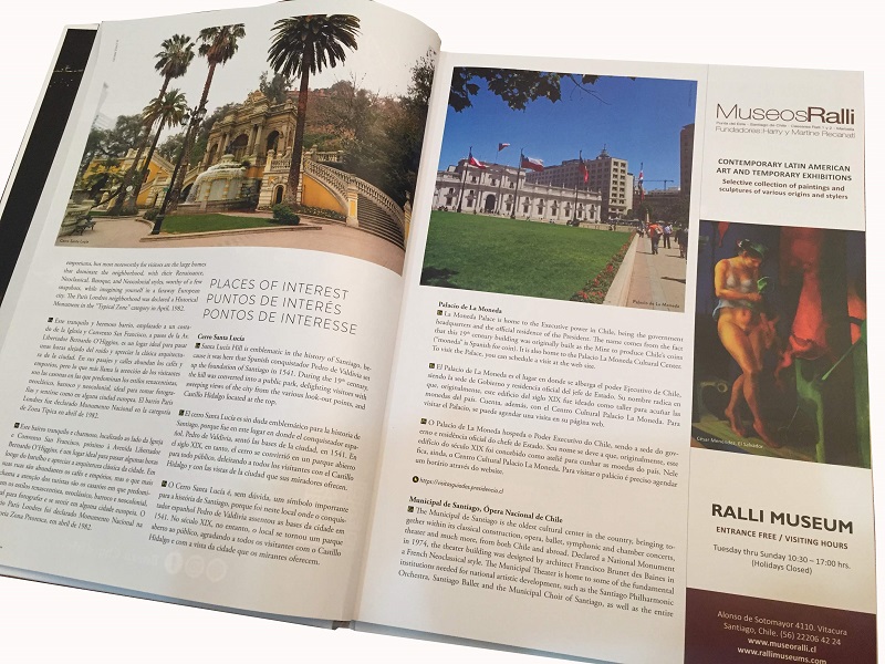 En este exclusivo libro encuentras una diversidad de datos y sugerencias acompañados de excelentes fotografías que ilustran los sitios más icónicos que debes conocer cuando visites nuestro país. Desde el nacimiento del “hotel book” en el año 2004, se distribuye en las habitaciones de los mejores hoteles de Santiago. El libro cuenta con una versión digital que puedes descargar, sin costo, en http://www.thebestofsantiago.com