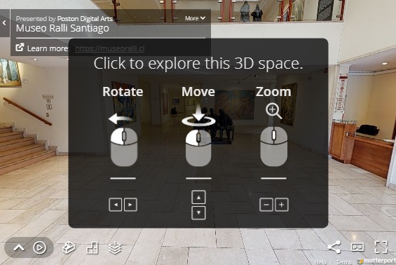 Los usuarios deben manejar con toda soltura el mouse o deslizar el dedo por el touchpad para generar los desplazamientos en su visita virtual, a medida que el recorrido avanza se puede interactuar con hitos de interés con información desplegable. Confiamos que las nuevas tecnologías de Poston Digital Arts posibilitará un acercamiento muy satisfactorio al gran acervo que resguarda Museo Ralli Santiago.
