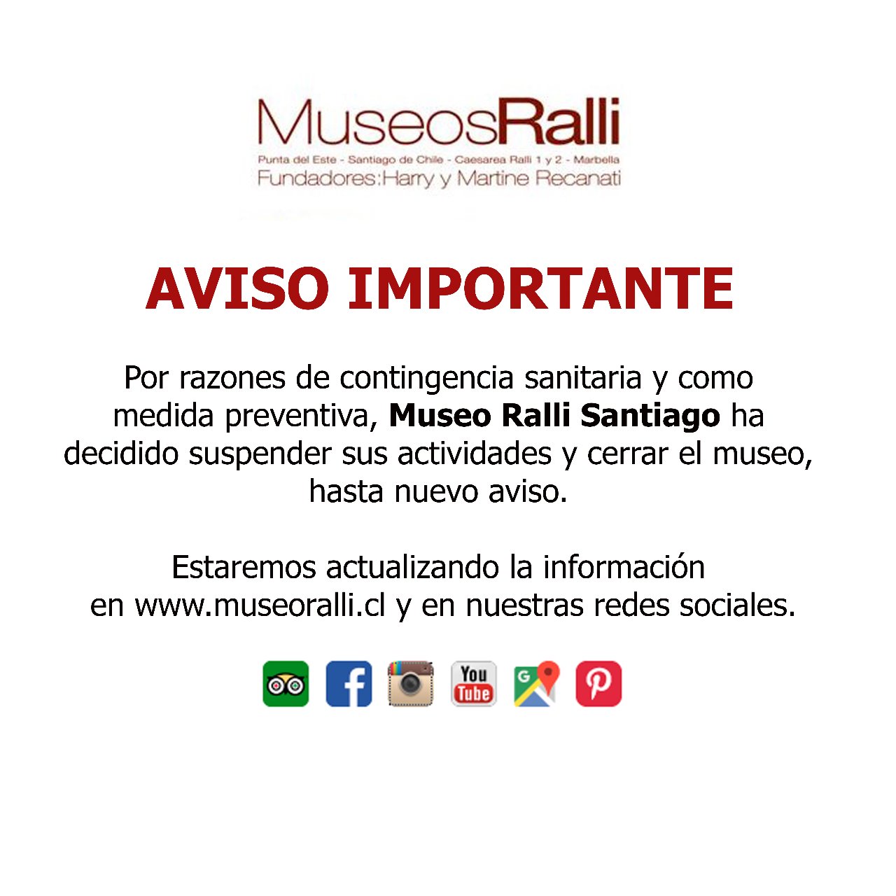 En atención a la contingencia sanitaria nacional por pandemia de Coronavirus que vive nuestro país, Museo Ralli Santiago determinó suspender la atención a público y las actividades planificadas para los próximos meses hasta nuevo aviso. El museo concentrará sus consultas a través de nuestra página web www.museoralli.cl y del correo institucional Esta dirección de correo electrónico está siendo protegida contra los robots de spam. Necesita tener JavaScript habilitado para poder verlo..