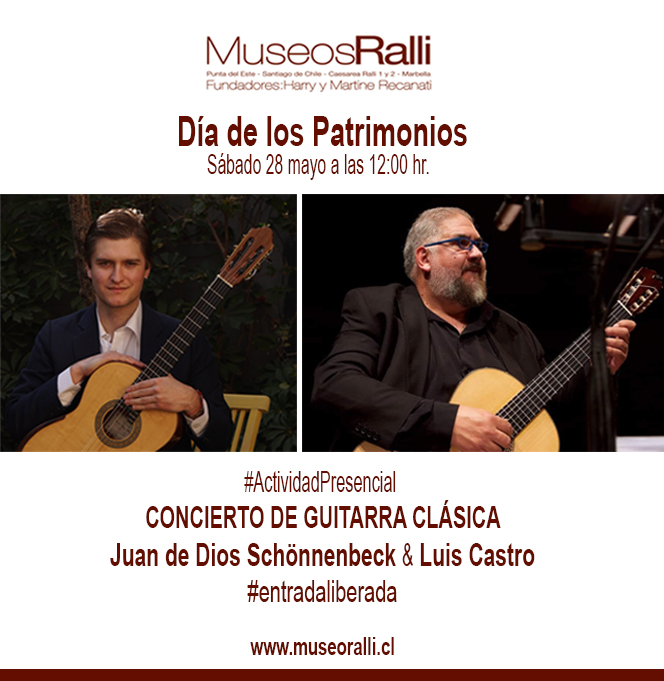 En esta oportunidad, Museo Ralli Santiago interesado en divulgar la cultura en todas sus expresiones, acogerá el sábado 28 de mayo -a las 12:00 horas en Sala 8- un concierto de guitarra clásica a cargo de los destacados concertistas nacionales Juan de Dios Schönnenbeck y Luis Castro. El repertorio de guitarra clásica incluirá piezas de música latinoamericana del siglo XX, interpretaciones de canciones de raíz popular; así como piezas doctas contemporáneas. El concierto es gratuito, no requiere inscripción previa.