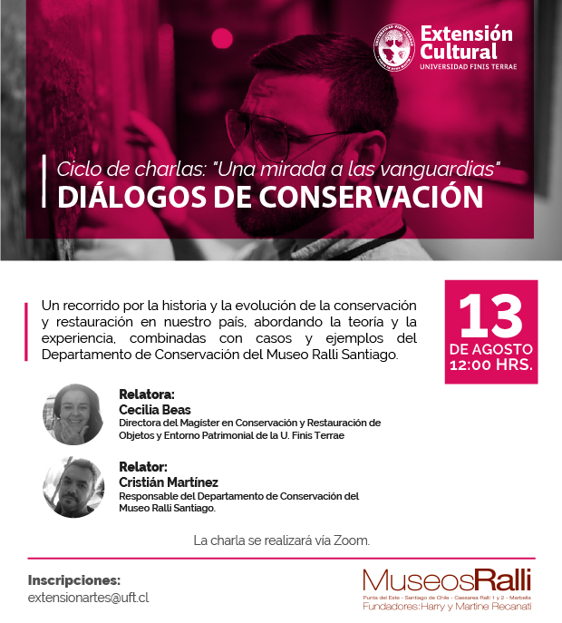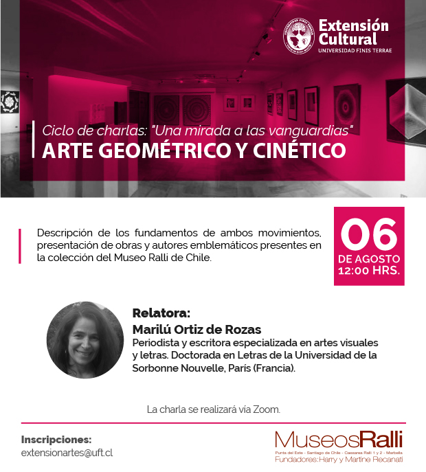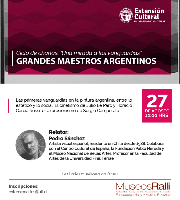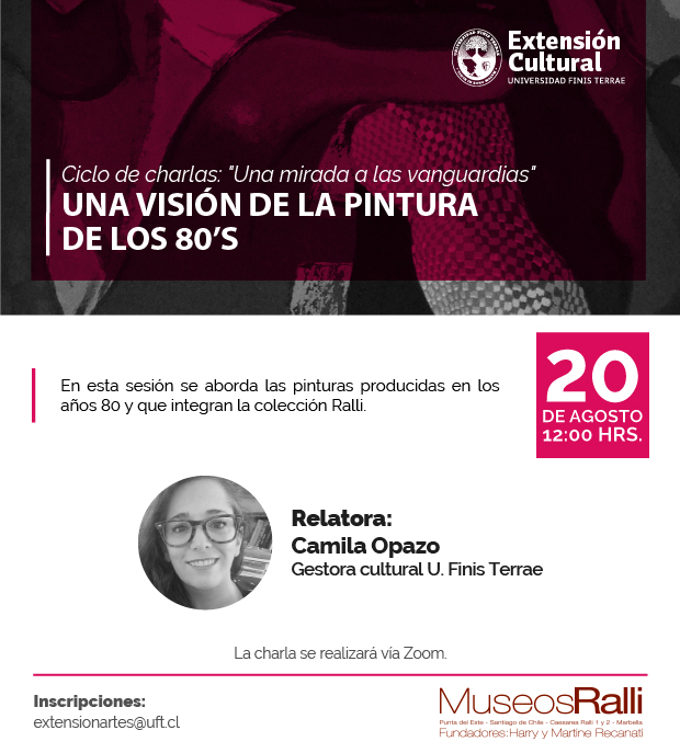 En el marco de la emergencia sanitaria vivida en nuestro país como en el mundo, Museo Ralli Santiago en forma conjunta con el Centro de Extensión de la Facultad de Artes de Universidad Finis Terrae en el mes de mayo de 2020 se dio inicio a un ciclo de 6 charlas online gratuitas. En los encuentros vía Zoom, distintos relatores hicieron un recorrido por diferentes corrientes artísticas y movimientos, abordaron la colección Ralli, analizaron sus obras, se refirieron a los estilos, a la vida y trayectoria de destacados artistas que son parte del patrimonio de Museo Ralli Santiago, Chile.