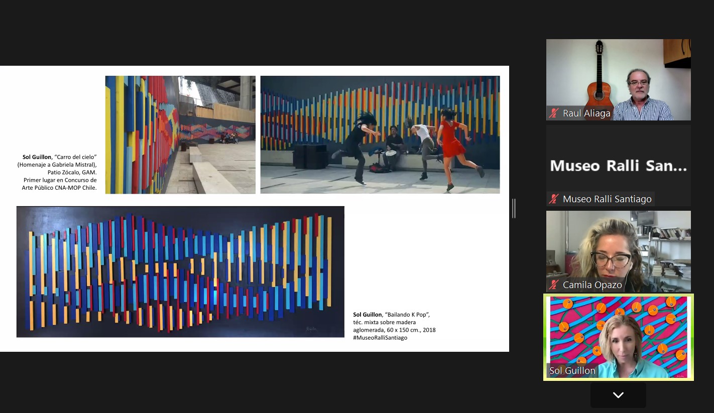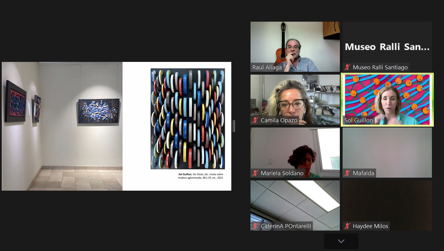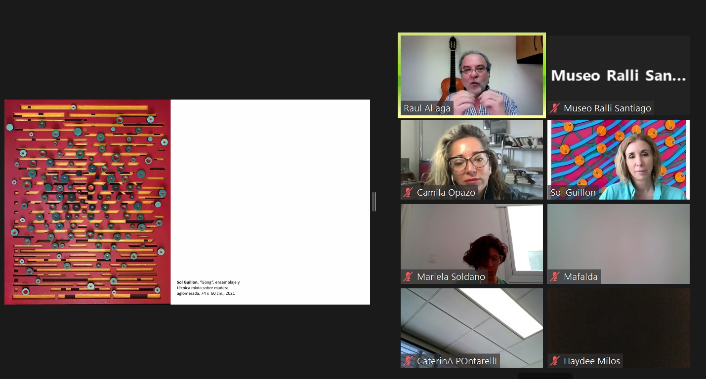 En el marco del ciclo de charlas online organizado por Extensión Cultural de la Facultad de Arte de Universidad Finis Terrae en conjunto con Museo Ralli Santiago, el pasado encuentro vía Zoom del jueves 17 de noviembre abordó la relación y sinergia entre arte y música. Mediante la revisión de la actual exposición “Partituras pregnantes” de Sol Guillon, que se exhibe hasta el 23 de diciembre de 2022, en las salas 10 y 11 de #MuseoRalliSantiago, la destacada artista nacional junto al profesor de música invitado, Raúl Aliaga -percusionista de la agrupación musical chilena de estilo fusión latinoamericana Congreso-, analizaron la propuesta artística de Guillon. Los relatores conversaron sobre las secuencias rítmicas, las melodías y las notas musicales percibidas en las composiciones bidimensionales de Guillon y sobre todo, realizaron una reflexión en torno a la integración –cooperación- entre las dos disciplinas.