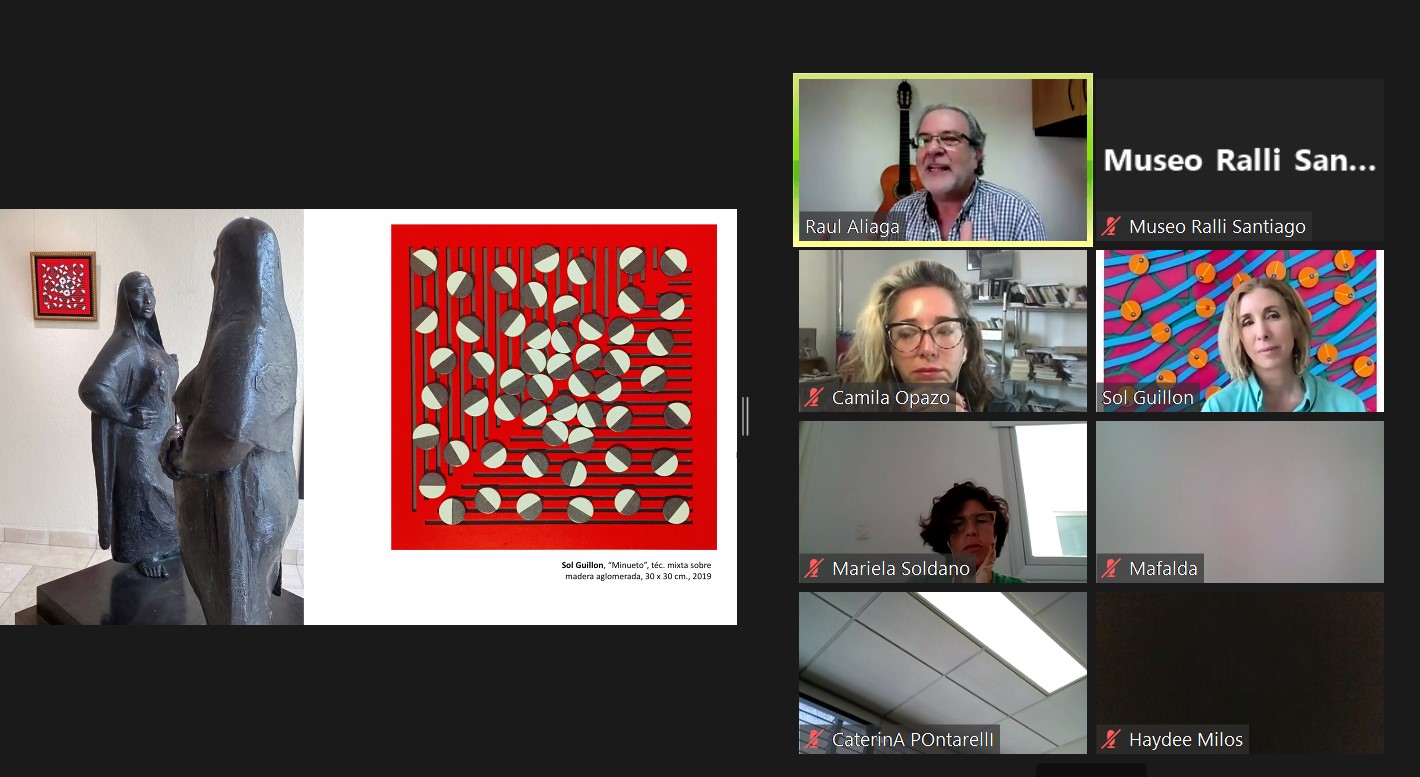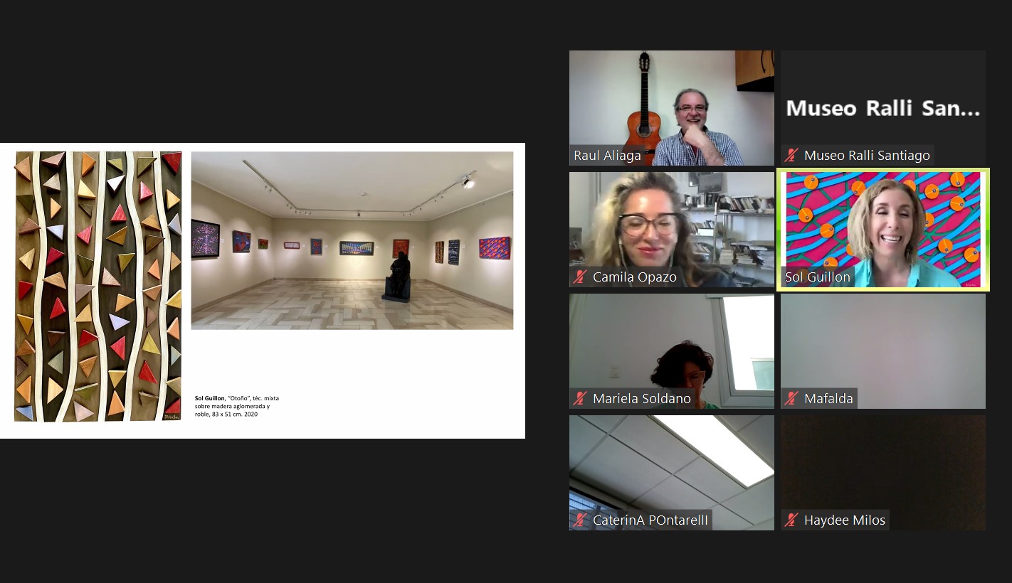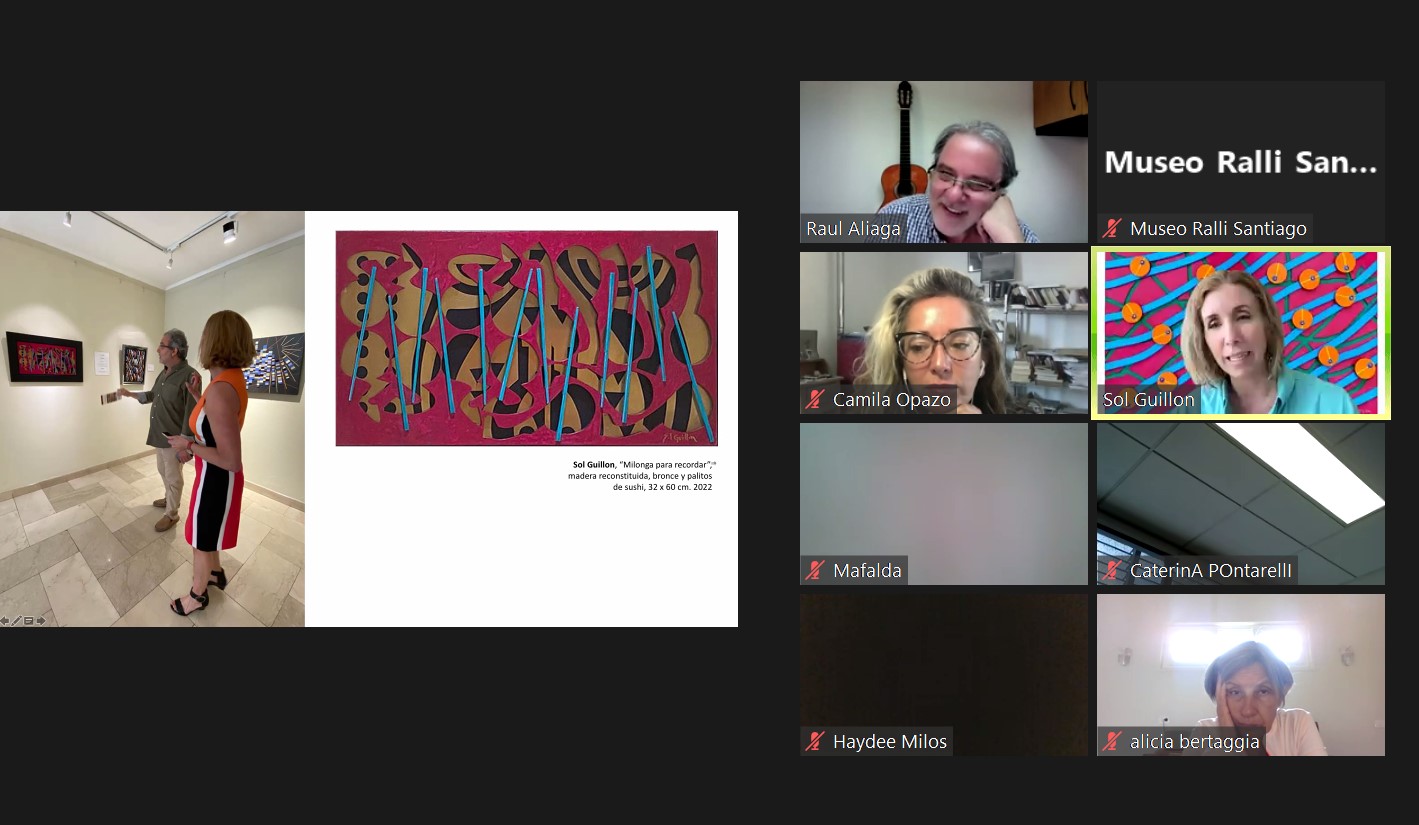 En el marco del ciclo de charlas online organizado por Extensión Cultural de la Facultad de Arte de Universidad Finis Terrae en conjunto con Museo Ralli Santiago, el pasado encuentro vía Zoom del jueves 17 de noviembre abordó la relación y sinergia entre arte y música. Mediante la revisión de la actual exposición “Partituras pregnantes” de Sol Guillon, que se exhibe hasta el 23 de diciembre de 2022, en las salas 10 y 11 de #MuseoRalliSantiago, la destacada artista nacional junto al profesor de música invitado, Raúl Aliaga -percusionista de la agrupación musical chilena de estilo fusión latinoamericana Congreso-, analizaron la propuesta artística de Guillon. Los relatores conversaron sobre las secuencias rítmicas, las melodías y las notas musicales percibidas en las composiciones bidimensionales de Guillon y sobre todo, realizaron una reflexión en torno a la integración –cooperación- entre las dos disciplinas.
