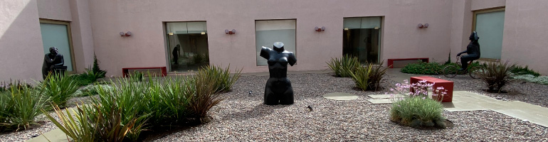 Nos es grato comunicar la renovación del Jardín interior de esculturas. Éste es un espacio abierto en el centro y que se conecta al museo por medio de 4 puertas de vidrio abatibles. En él, hay 3 esculturas en bronce de gran formato de los artistas mexicanos: Gerardo Quiroz, “Meditación”; Salomón Cazares, “Torso” y Mario Aguirre Roa, “Bicicleta”. A su alrededor, 9 salas que exhiben la colección permanente de arte latinoamericano.