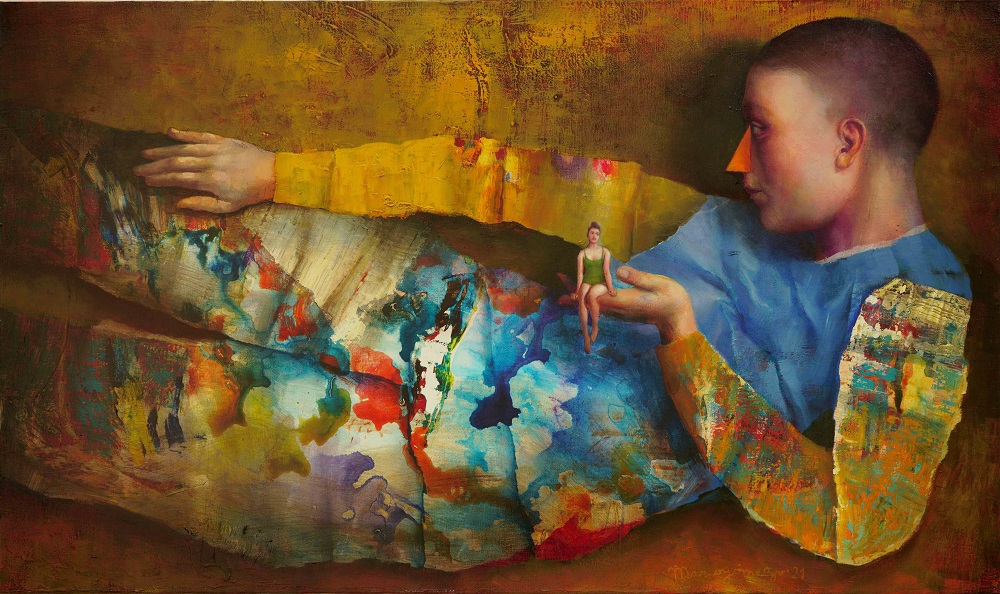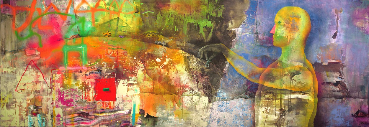 La actual propuesta de Gómez comenzó en el 2022, y ésta tomó un giro hacia cierto tipo de abstracción expresionista, sin abandonar ciertos elementos figurativos característicos del autor, como resultado de la incorporación de elementos pictóricos en los cuales el color domina la forma y los personajes ingresan como extensión del entorno y nos invita a pensar el mundo desde un sentido sacro-simbólico. Estos personajes, en tránsito y en descanso, se fusionan con texturas bien definidas y otras que transitan a la mancha arcaica, o la línea cruda. “Los juguetes (que alguien podría llevar en el bolsillo) y las imágenes que llenan la tela son, quizás, de las más lúdicas y experimentales que he producido en los últimos 10 años. El enfoque se desplaza del ser humano para invitar al escenario mismo a protagonizar la obra, y en esta búsqueda de re-planteamiento, comienzan a aparecer paletas oscuras y elementos más velados que remiten a la solemnidad de los paisajes románticos”, comenta Gómez.