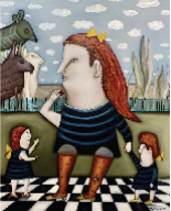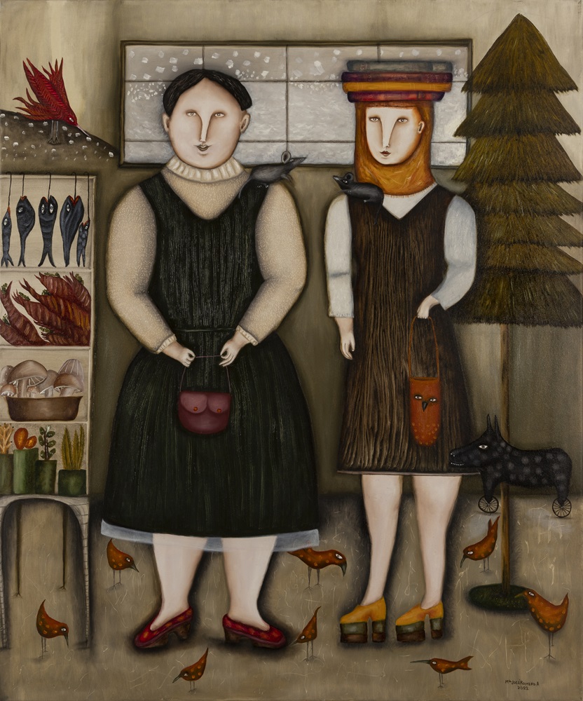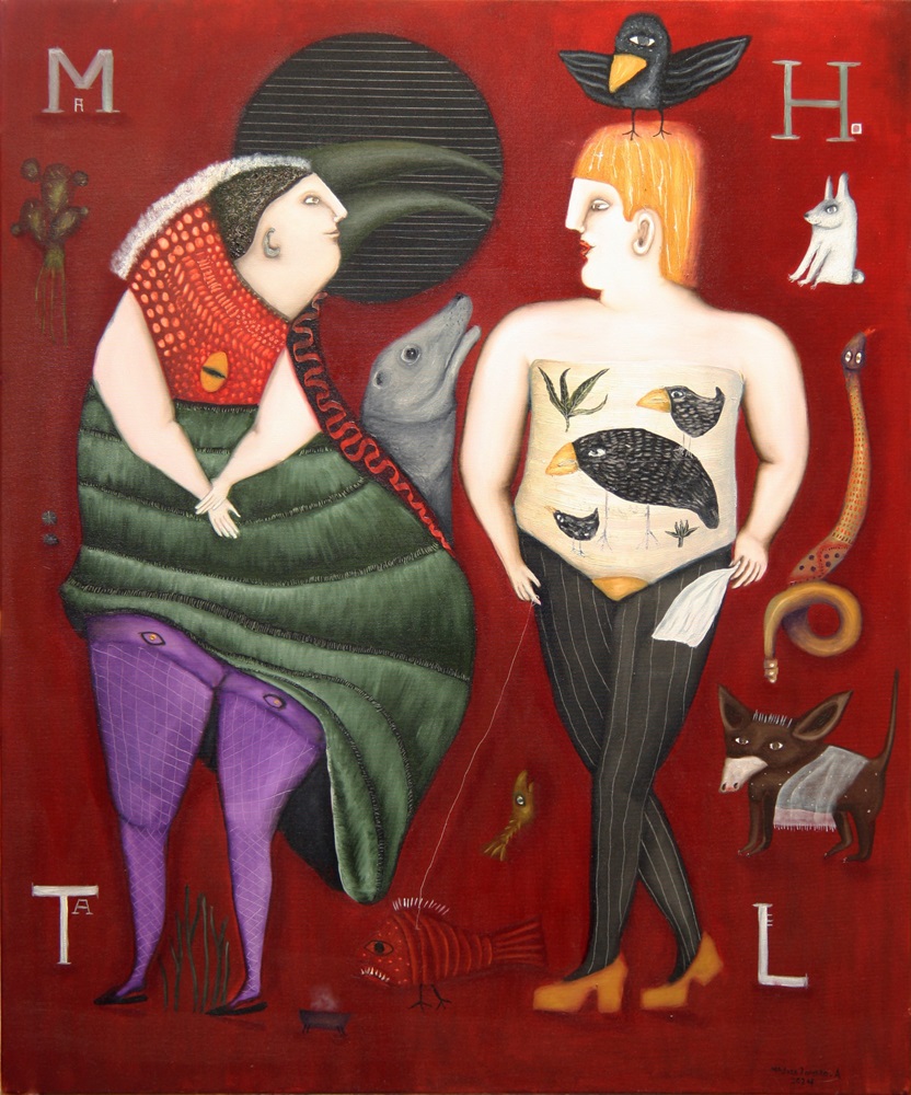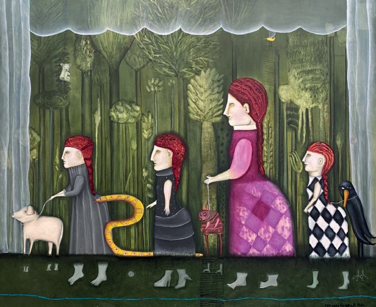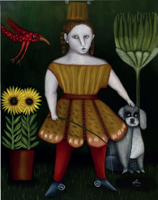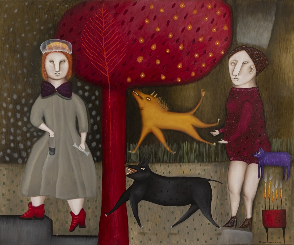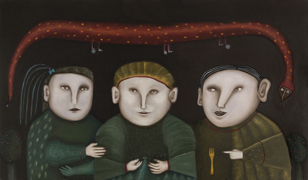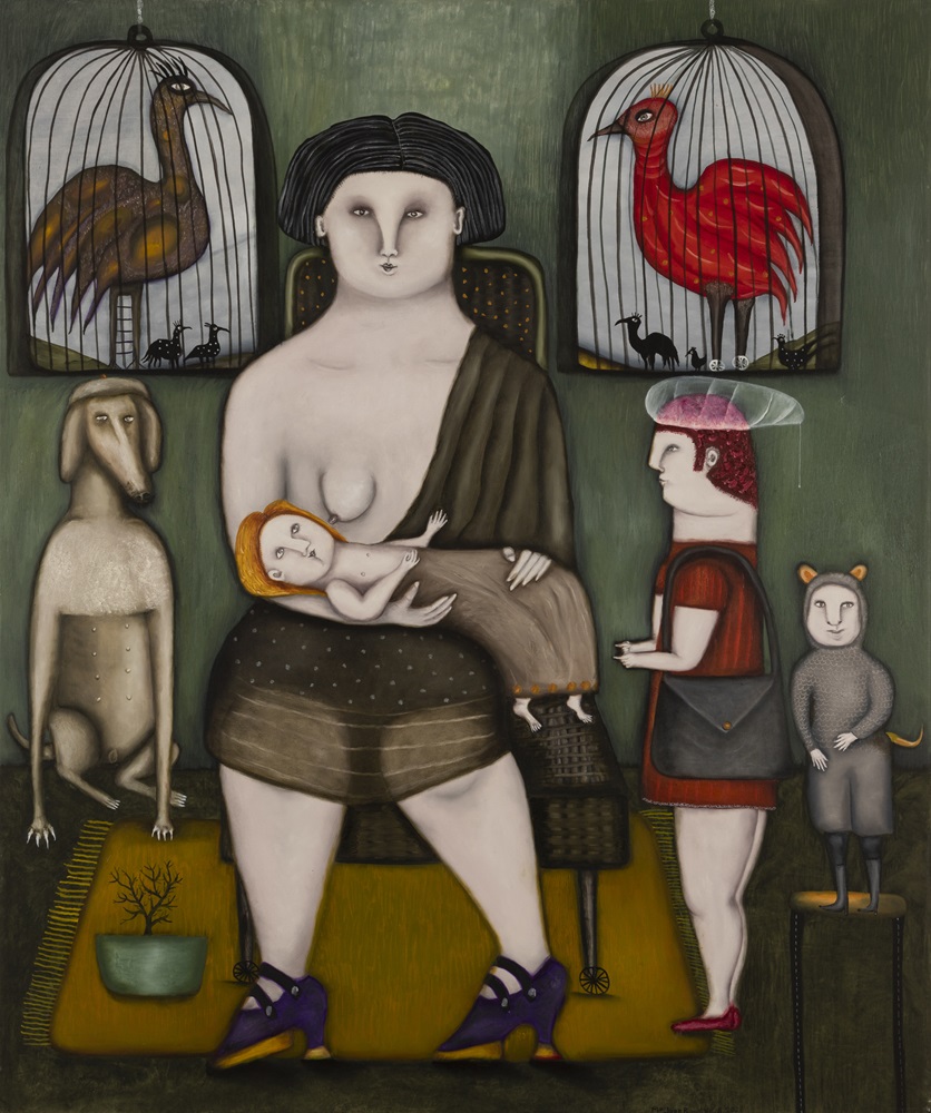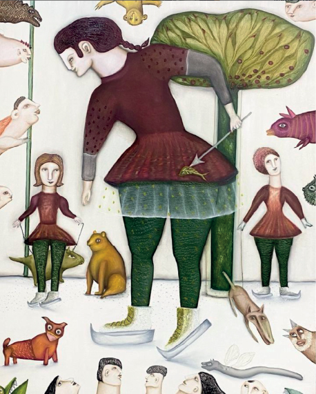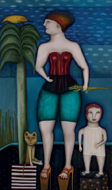 Cada lienzo muestra una escena o una situación familiar, que la artista deforma, exagera y llena de colores, de detalles extravagantes: ojos en calcetines, animales con tacos, cabezas sin cuerpos. Y es así como en esta operación hace aparecer lo extraño, incluso lo grotesco, para revelarnos que es ahí, precisamente, donde podemos encontrarnos con la belleza. Y la gracia.