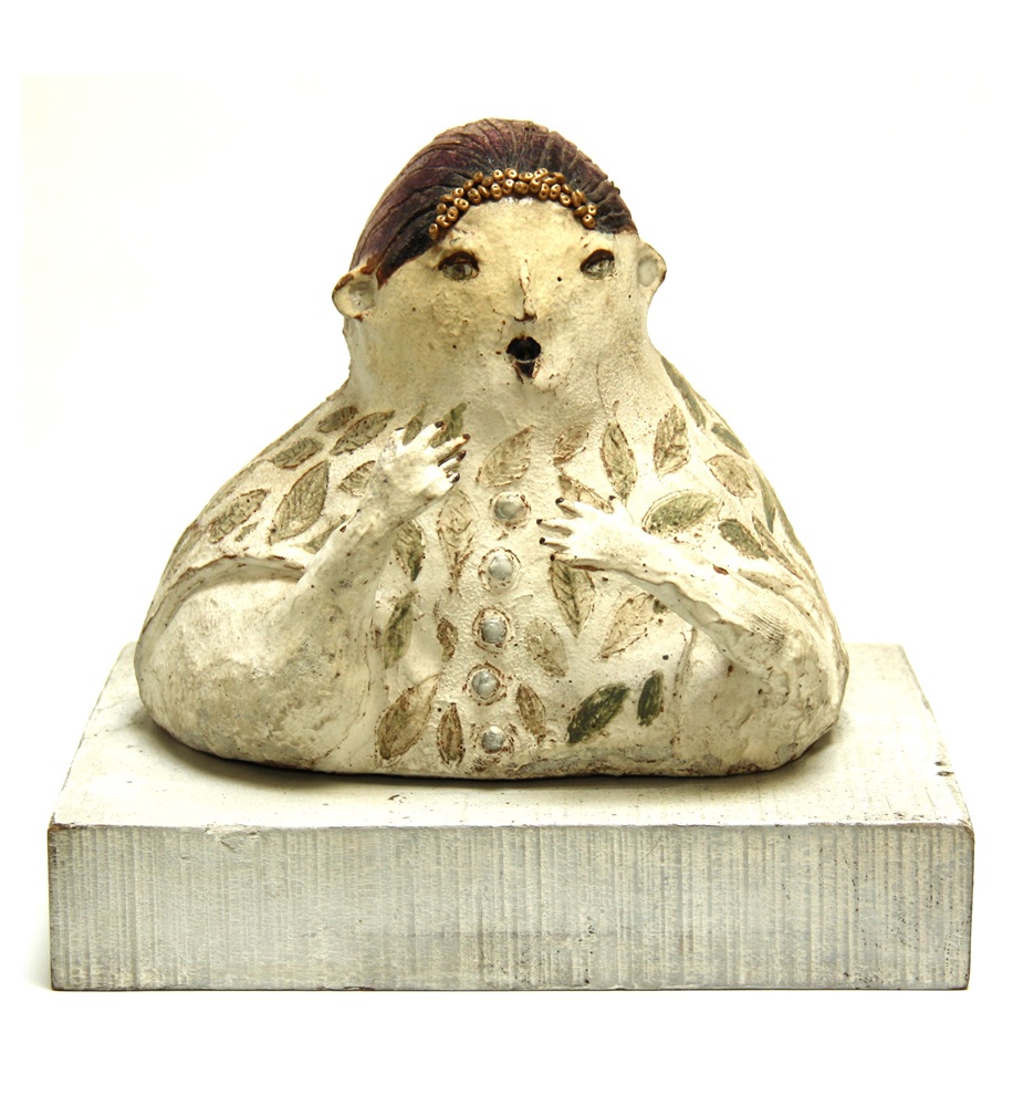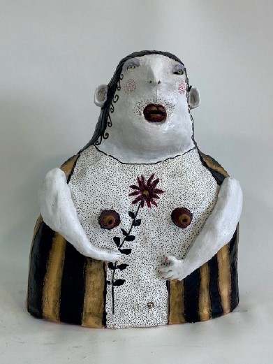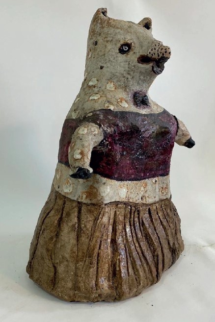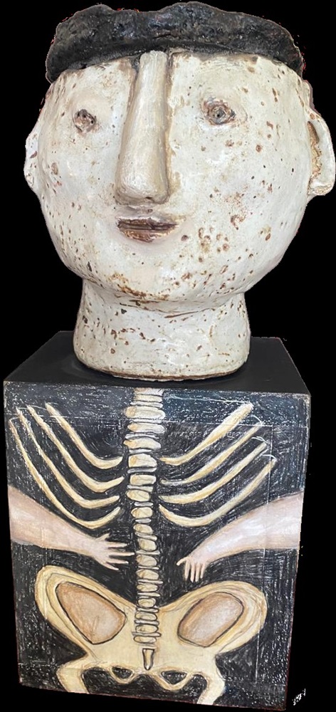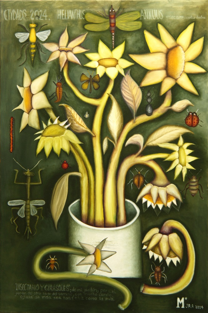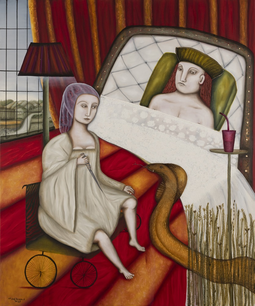 La muestra está compuesta por 14 obras -de gran y mediano formato- en óleo sobre tela, creadas desde el 2022 a la fecha y 3 esculturas en cerámica gres. Su trabajo figurativo rescata experiencias personales y el entorno cotidiano, a través del lenguaje de la pintura indaga en la identidad, la mitología y los arquetipos. Los elementos centrales de su obra son los animales, personajes, la vegetación y escenarios donde coexisten con objetos que surgen del inconsciente.