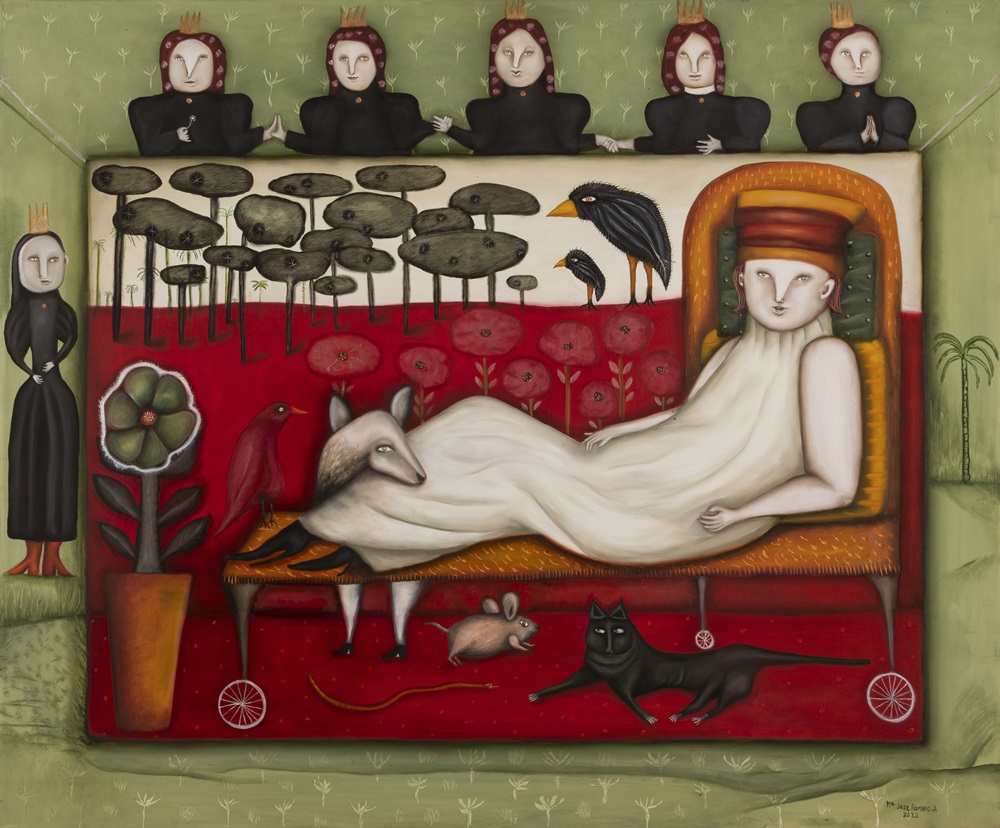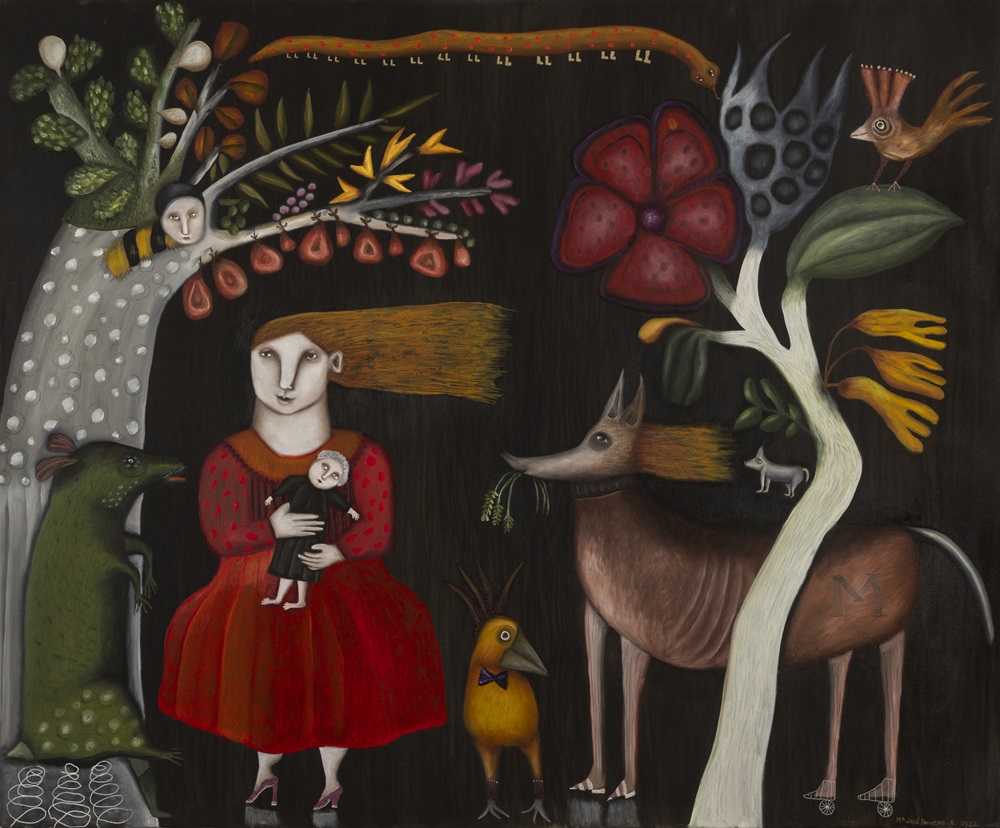 En sus cuadros, las emociones se transforman en animales que acompañan a los personajes humanos de aspectos deformes y de rostros serios, a veces solemnes, que son mostrados en su vulnerabilidad, expuestos incluso levemente, al ridículo. Serpientes, pájaros, mujeres, niños, perros, hombres, gatos y un sinfín de criaturas fantásticas coexisten en un universo de colores vibrantes. Los trazos y formas evocan desde las pinturas rupestres y el arte egipcio hasta los dibujos infantiles. Mientras los niños juegan a ser adultos, María José juega a ser niña o a volver a épocas muy antiguas, para mirar de nuevo, quizás, lo que como adultos civilizados ya no podemos ver: la magia”.